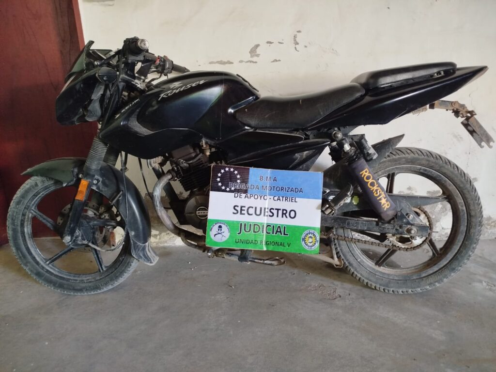 Efectivos de la Brigada Motorizada de Apoyo (BMA) de Catriel secuestraron una motocicleta que presentaba pedido de secuestro vigente por robo y documentación apócrifa. El procedimiento se realizó durante recorridas de prevención sobre la intersección de avenida San Martín y calle La Pampa, donde los uniformados observaron un motovehículo estacionado con una chapa patente de papel.