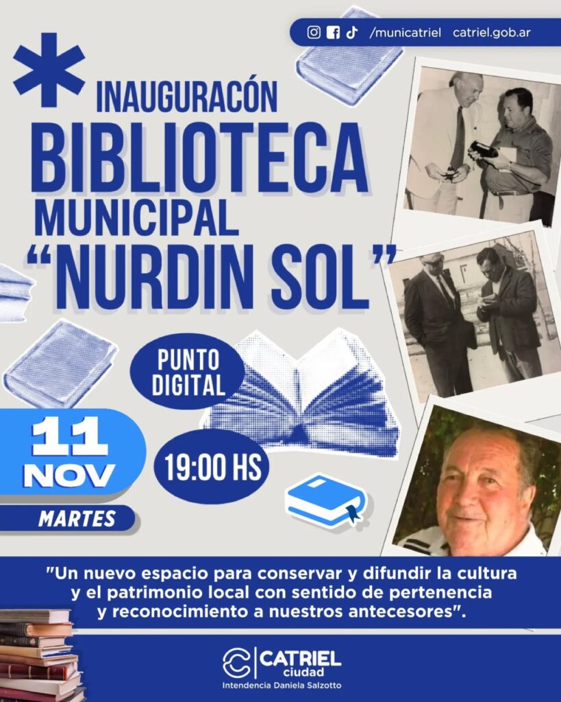 En Catriel, la historia late en cada calle, en cada gesto, en cada recuerdo de quienes hicieron posible nuestra ciudad. Es por eso que la Municipalidad invita a toda la comunidad a un momento único: la inauguración de la Biblioteca Municipal “Nurdin Sol”, un espacio donde la cultura, la memoria y la pertenencia se encuentran para celebrar lo que somos y de dónde venimos.